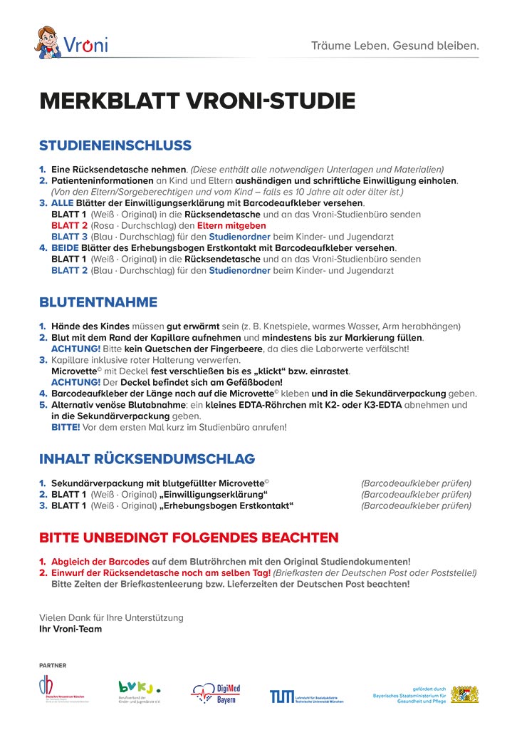 Mit der Vroni-Studie soll allen Kindern in Bayern, Niedersachsen, Bremen und Hamburg, im Rahmen der Voruntersuchungen U9 bis J1 (5-14 Jahre) oder eines anderen Kinderarztbesuches im Alter von 5-14 Jahren ein Screening auf FH angeboten werden. Nach schriftlicher Einwilligung werden aus der Fingerbeere 200 µl Kapillarblut entnommen und das LDL-Cholesterin (LDL-C) am Deutschen Herzzentrum München (DHM) bestimmt.